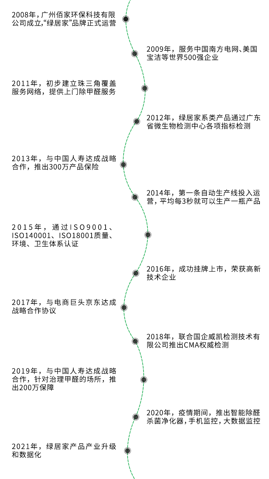 自2008年公司成立以來,憑借著對(duì)市場(chǎng)的精準(zhǔn)預(yù)判及科學(xué)的發(fā)展戰(zhàn)略,綠居家快速搶占室內(nèi)空氣治理市場(chǎng),不斷擴(kuò)大發(fā)展規(guī)模。面對(duì)日新月異的市場(chǎng)競(jìng)爭(zhēng),綠居家不斷增強(qiáng)產(chǎn)品及技術(shù)創(chuàng)新水平,并與京東、CVC威凱、中國(guó)人壽等知名企業(yè)建立了戰(zhàn)略合作關(guān)系,不斷邁向?qū)儆诰G居家更高的發(fā)展階梯。