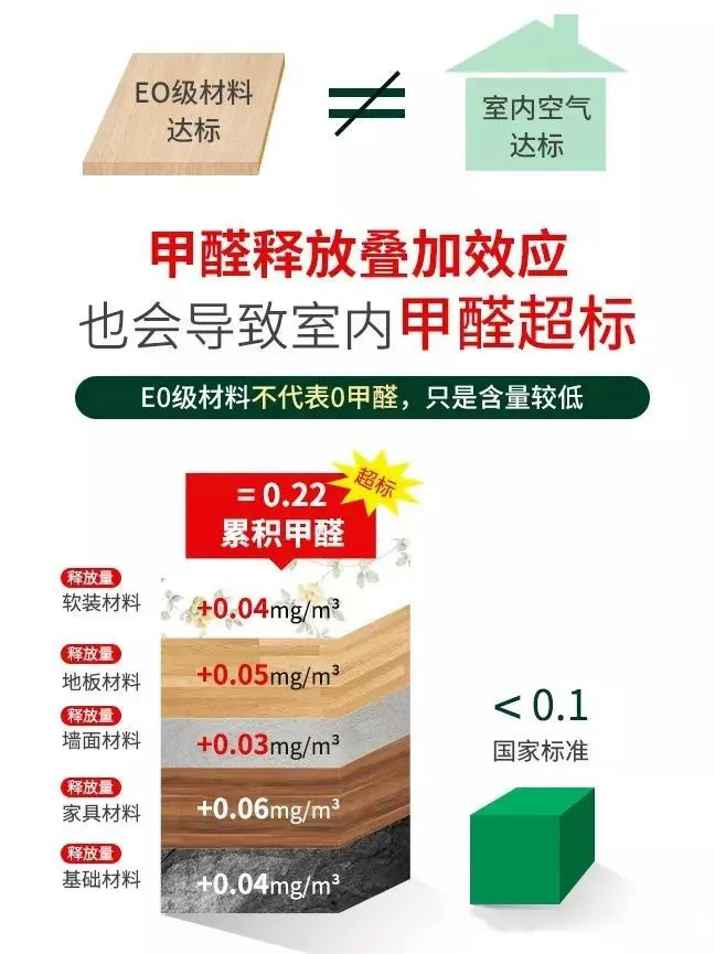 也就是說,環(huán)保材料中也會含有甲醛,并在3-15年內(nèi)持續(xù)排放。“環(huán)保材料”只是材料樣品在實驗室環(huán)境下,檢測出其一定時間內(nèi)的甲醛釋放量符合國家標準。所以,“環(huán)保材料”也是含有甲醛的,只是其甲醛釋放量較低,符合國家標準規(guī)定而已。而這些甲醛釋放量較低的環(huán)保材料一旦全部放到同一個空間,就會出現(xiàn)“甲醛疊加效應(yīng)”