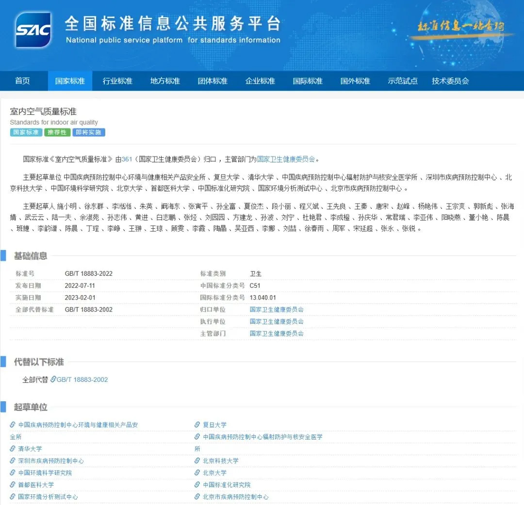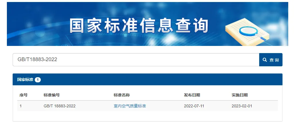 由國家市場監(jiān)督管理總局與國家標(biāo)準(zhǔn)化管理委員會批準(zhǔn)發(fā)布的GB/T 18883-2022《室內(nèi)空氣質(zhì)量標(biāo)準(zhǔn)》自2023年2月1日起正式實施,歸口單位為國家衛(wèi)生健康委員會。