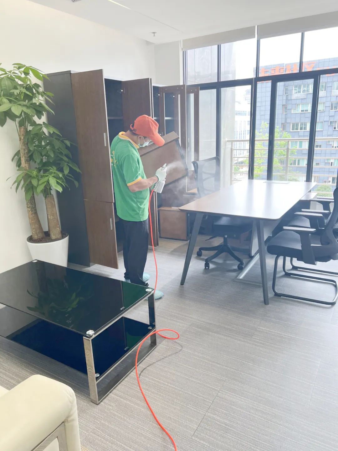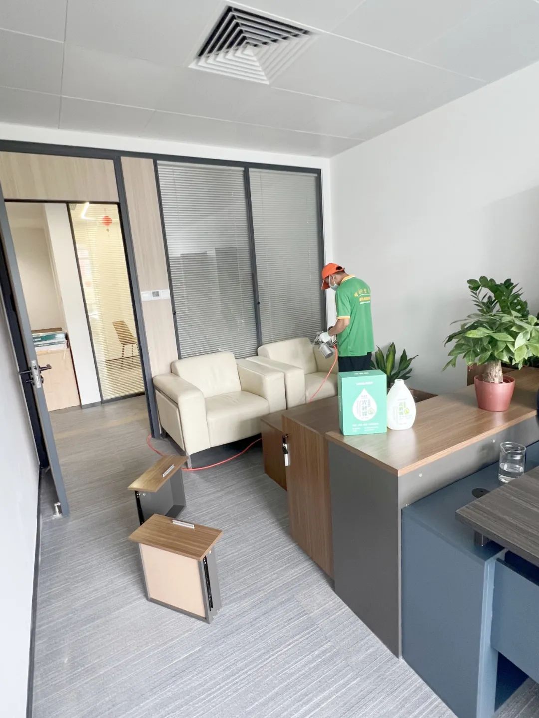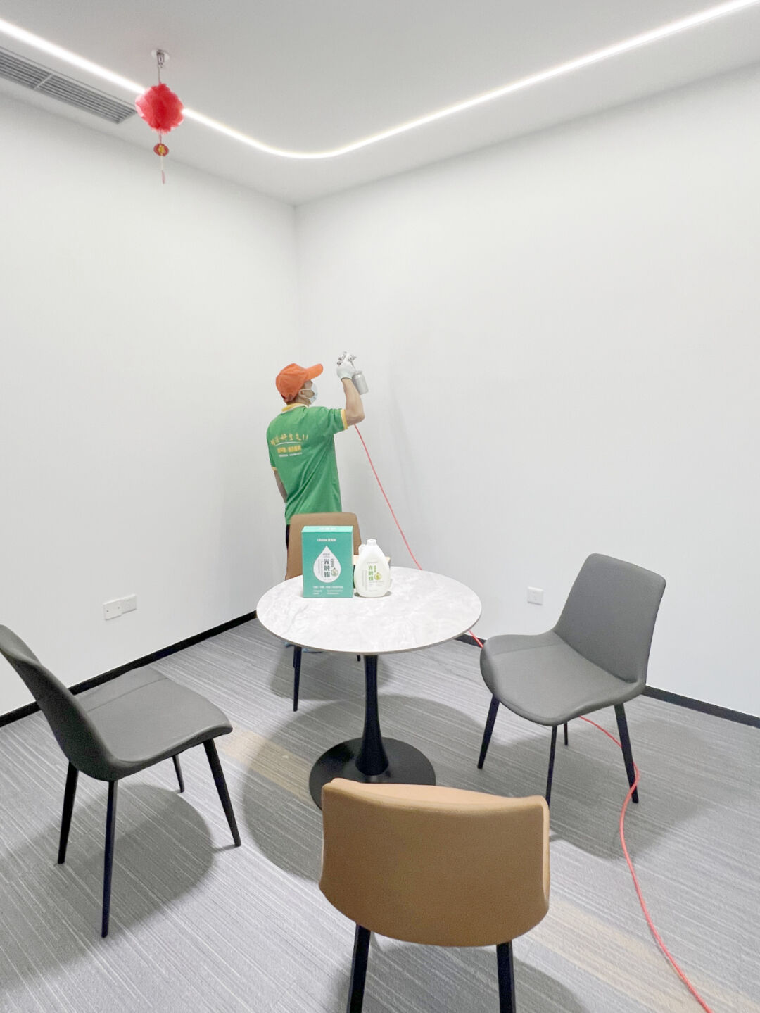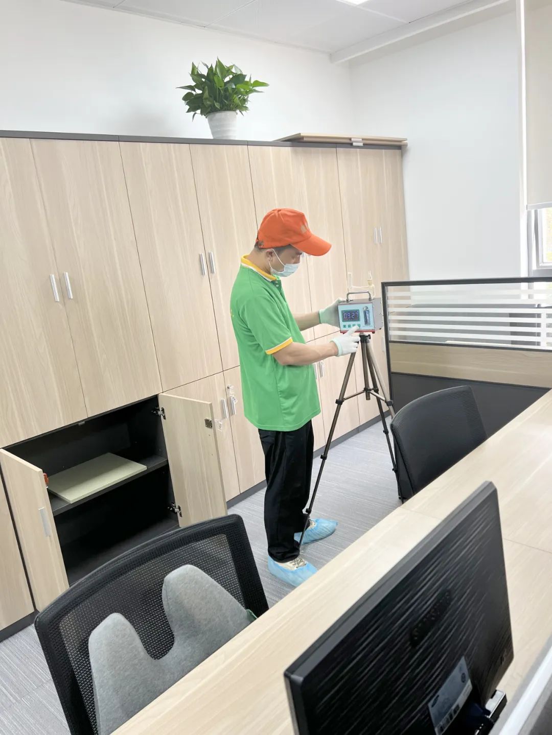 正式治理時,綠居家工程師團隊將裝了除醛產(chǎn)品的電動噴槍,對準辦公桌、辦公椅、沙發(fā)、柜子、天花等甲醛污染源進行全方位噴涂,并且針對柜子這些甲醛重災(zāi)區(qū)還會再進行加強治理,確保治理完成后甲醛、苯、TVOC等污染物降至國標范圍。