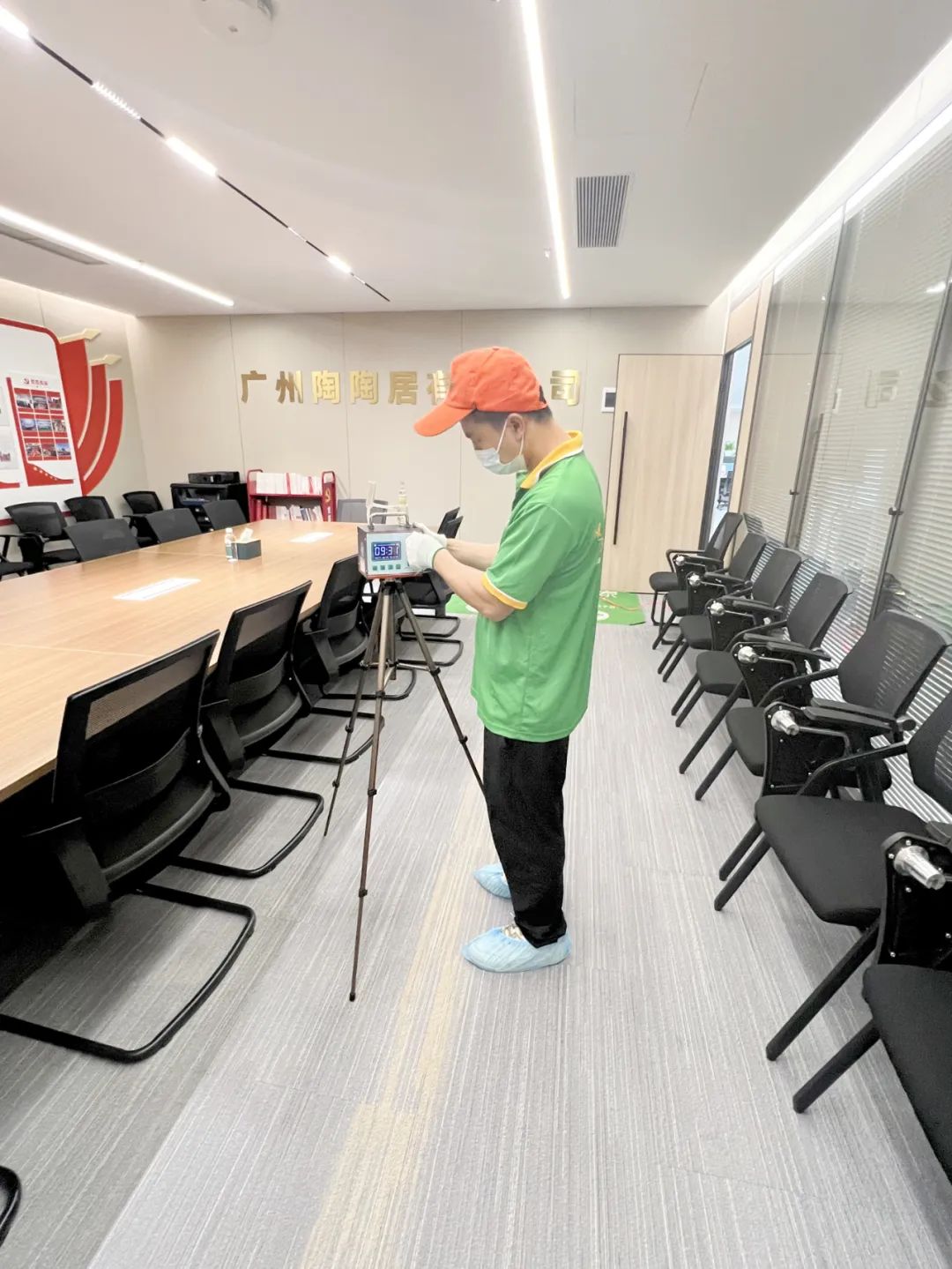 2024年4月13日,綠居家專業(yè)工程師團隊上門進行治理,本次治理面積約1210 平方米,使用的除醛產(chǎn)品為納米生物酶和復(fù)合光觸媒,除醛凈味一步到位。在正式治理之前,綠居家工程師先對現(xiàn)場進行甲醛含量的檢測,這一步驟主要是為制定除醛方案提供依據(jù)。