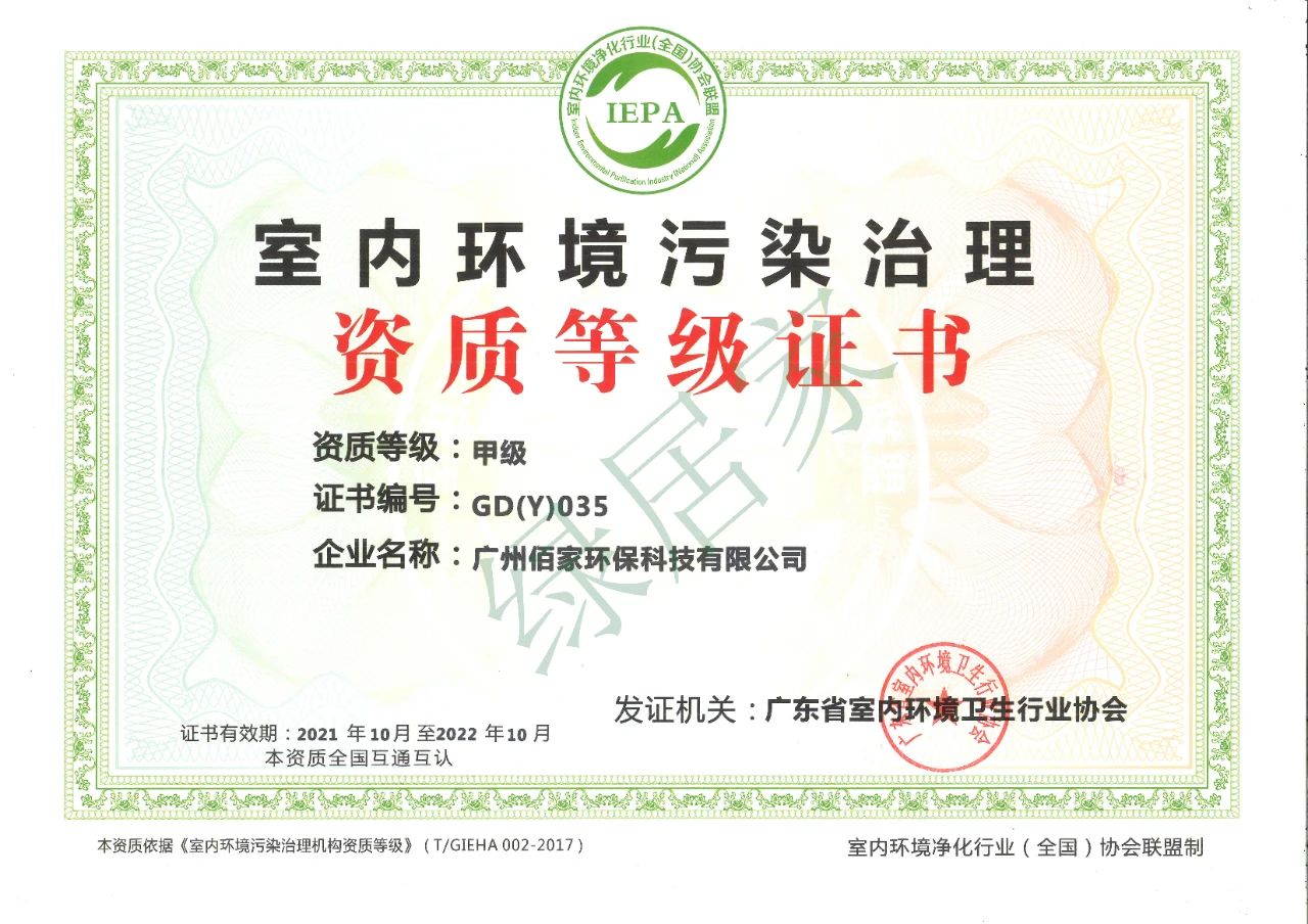 綠居家,專注室內(nèi)空氣污染治理16年,擁有室內(nèi)環(huán)境污染治理甲級資質(zhì)證書,此外還獲得廣東省室內(nèi)環(huán)境衛(wèi)生行業(yè)協(xié)會頒發(fā)的“A級能力推薦”證書、中國質(zhì)量品牌促進會聯(lián)合中國企業(yè)信譽評測中心頒發(fā)的“3A+級質(zhì)量信譽資質(zhì)單位”證書。